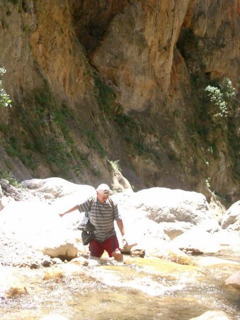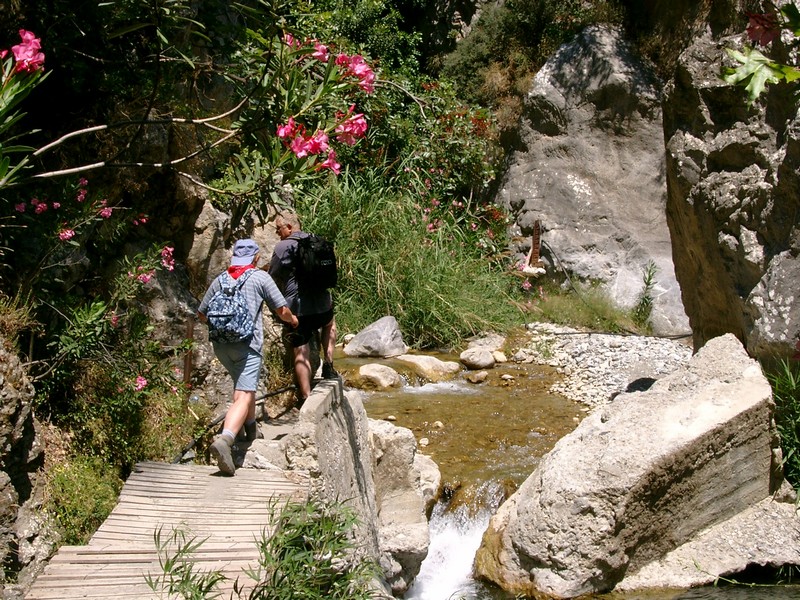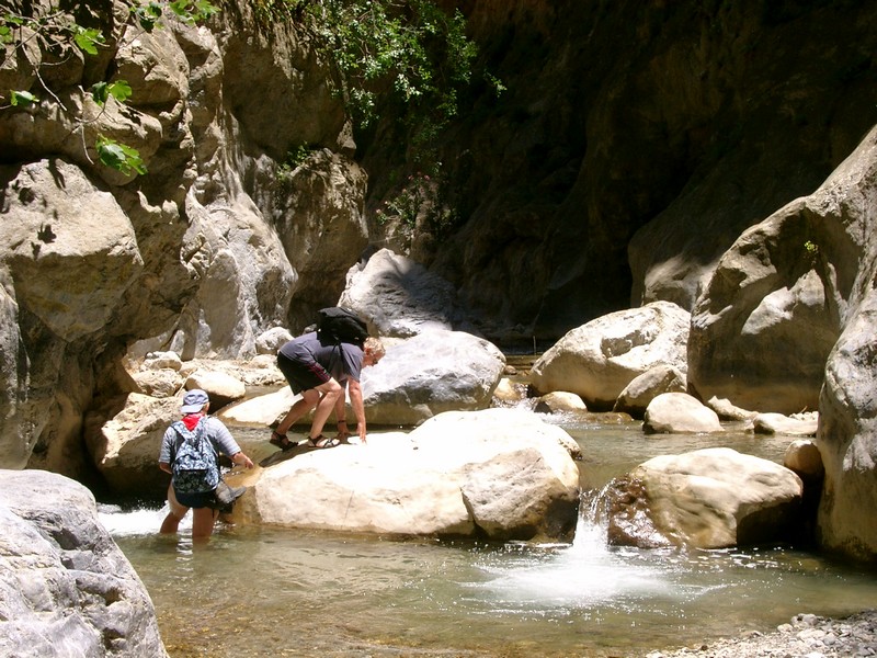 Von Mithi fahren wir noch ein Stück in Richtung Malés bis auf der linken Seite ein kleiner Parkplatz erscheint. Dort ist das Bachbett des Mirthós. Etwa 50m vor dem Bachbett geht es links einen Weg hoch zu einer Staumauer. 10m darüber verläuft ein alter Mühlenkanal. Diesem folgen wir bis zum Schluchtanfang. Ein Reiz dieser Tour liegt darin, dass der Bach das ganze Jahr über Wasser führt. Je nach Wasserstand muss man schon mal die Schuhe ausziehen, da der Weg im Verlauf das Bachbett mehrfach kreuzt. Die Routenführung durch die Schlucht ist eigentliche ziemlich eindeutig. Immer durch die Schlucht hat. Wir klettern über einige Felsblöcke, schlüpfen durch Felsenlöcher. An manchen Stellen ist schon Geschicklichkeit und etwas Kraft erforderlich, um sich die teilweise bis zu ca. 3,5m hohen Felsblöcke hochzudrücken. Manchmal geht es mit Spreiztechnik.