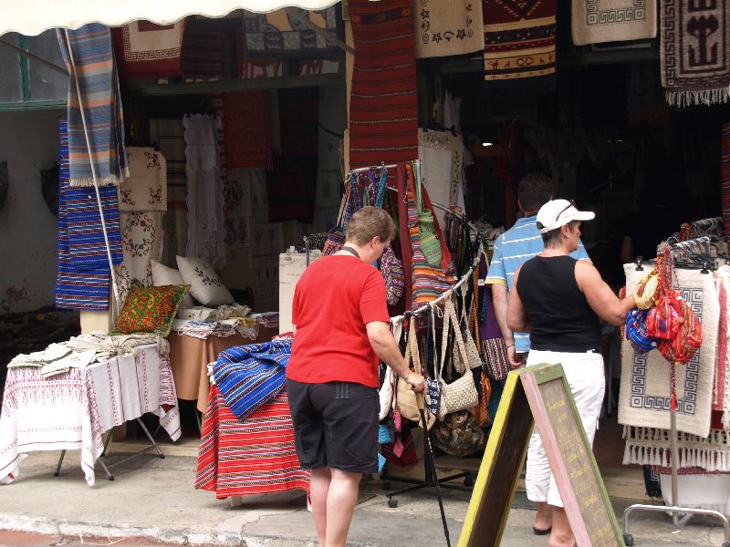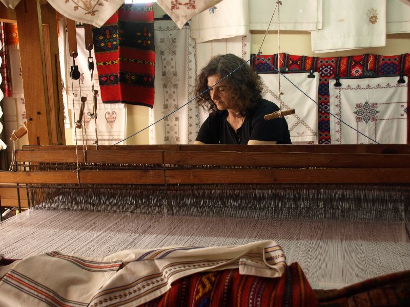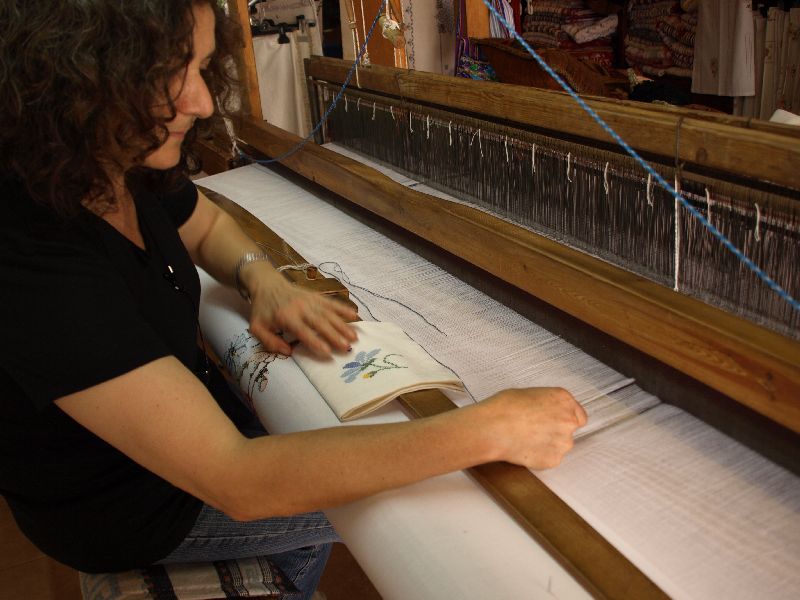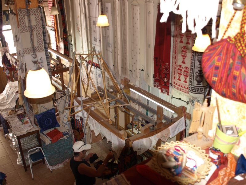 Gegenüber von Antonios Musikladen ist die Weberin von Zaros zu Hause. Mitos heißt die kretische traditionelle Weberei. Wir konnten der Weberin über die Schulter schauen als sie uns ihr schönes Handwerk am Webstuhl vorführte. Natürlich haben wir einen schönen handgewebten Tischläufer erstanden.