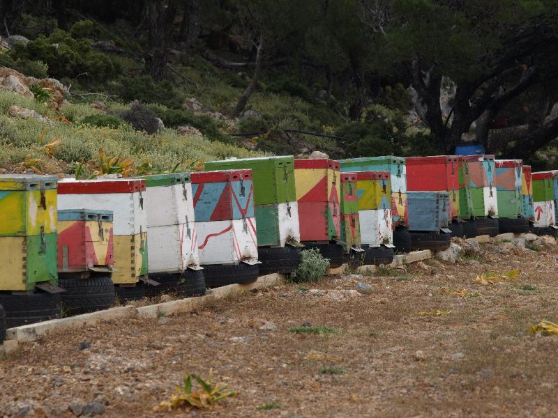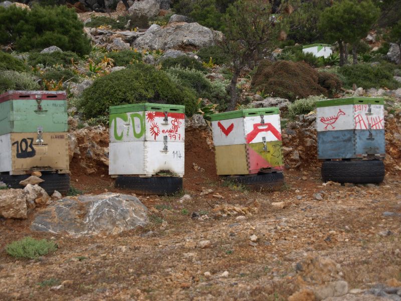 Am Nachmittag sind wir dann mit dem Allrad-Panda von Wolfgang bis zur Schutzhütte Samari oberhalb der Rowas-Schlucht gefahren. Dort hat man eine überwältigende Sicht in die Schlucht und auf Zaros und Umgebung. Unterwegs waren immer wieder Alpenveilchen und Schlangenwurz zu sehen, nicht zu vergessen die wunderschön bunten und bemalten Bienenkästen.
