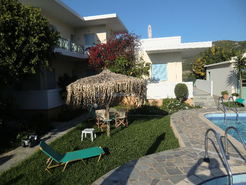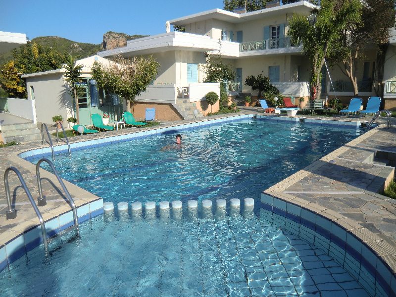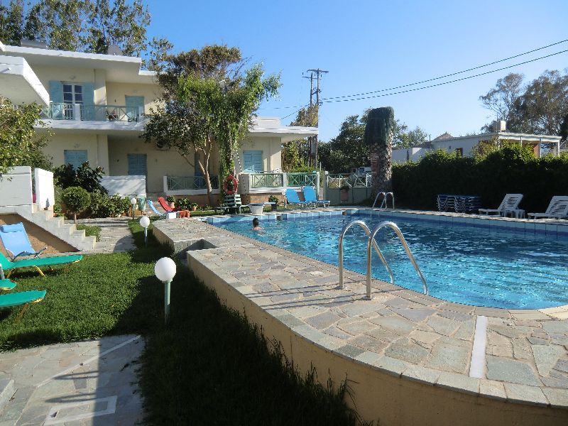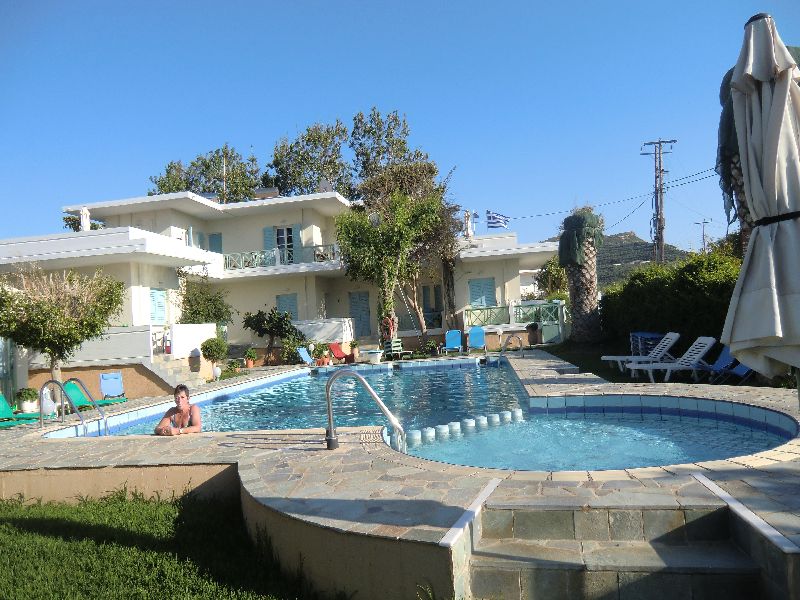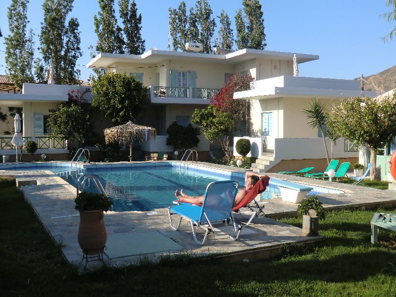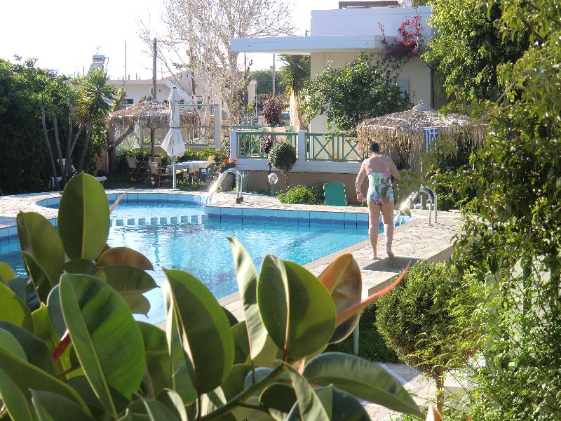 Von der Besitzerfamilie wurden wir dann sehr herzlich begrüßt und wir konnten uns selber ein Apartment aussuchen. Inge hat sich dann für eines gleich neben dem Pool entschieden und so hatten wir einen kurzen Weg zum Schwimmen. Das Meer war in der ersten Woche doch noch etwas frisch und wir hatten den schönen Pool morgends und abends für uns alleine. Die Anlage war so gut wie leer. Also schnell mal die Sachen ausgepackt und in den schön angelegten Garten noch ein weinig schwimmen und ausruhen.