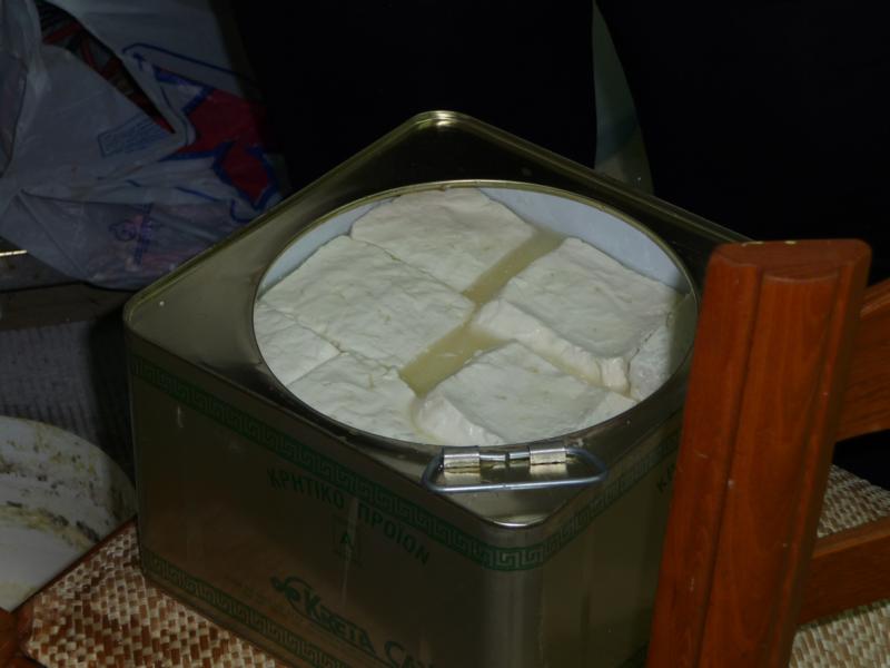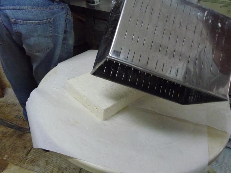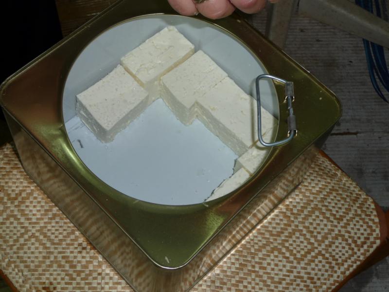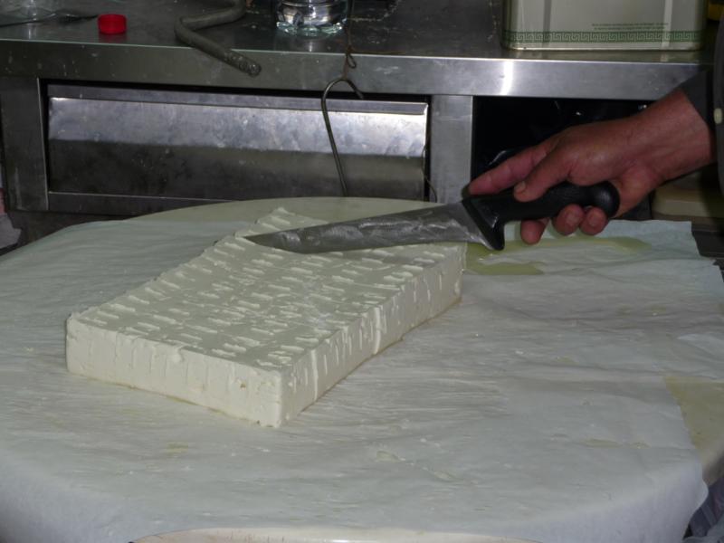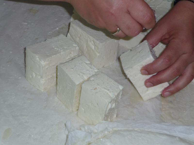 Lab? mit ständigem Rühren auf 35 Grad erhitzt.Salz wurde auch verwendet. Zwischendurch wurde schon fertiger Feta geschnitten und in Dosen verpackt.