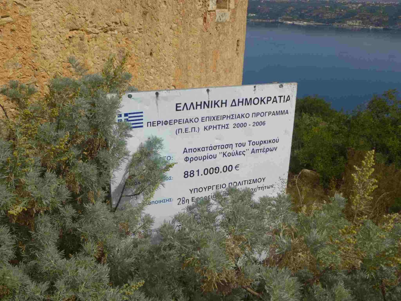 Im gleichen Urlaub war ich in Aptera. Hier wollte ich mir auch das türkische Kastell ansehen. Naja, ist ja nur ein Kasten mit hohen, dicken Mauern, eher pragmatisch als schön. Vielleicht ist innen ja was interessantes. Am Eingangstor angekommen leuchtet mir das, schon etwas eingewachsene,EU Schild entgegen. Aber mit Innenbesichtigung war wohl nix, Tor verschlossen, keinerlei Hinweise auf Öffnungszeiten. Also einen, nicht gerade schönen, Steinklotz für € 881.000 restauriert, den man sich nicht einmal ansehen kann.