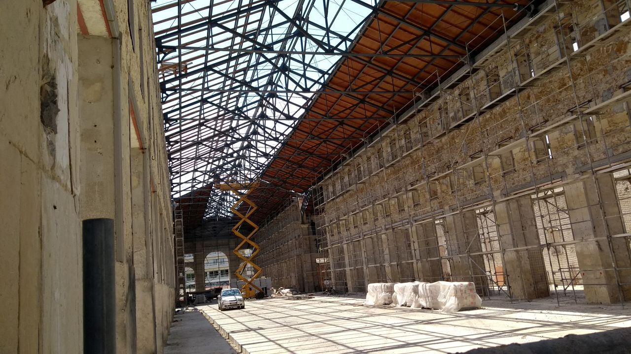 Die Markthalle ist bereits weitgehend entkernt worden, das alte Dach wurde komplett entfernt.