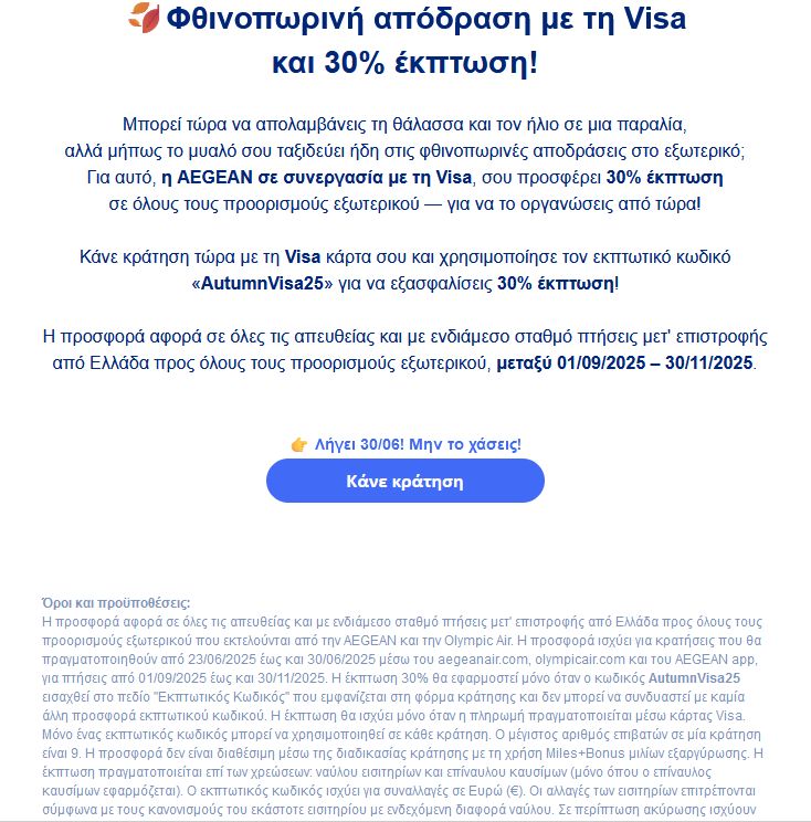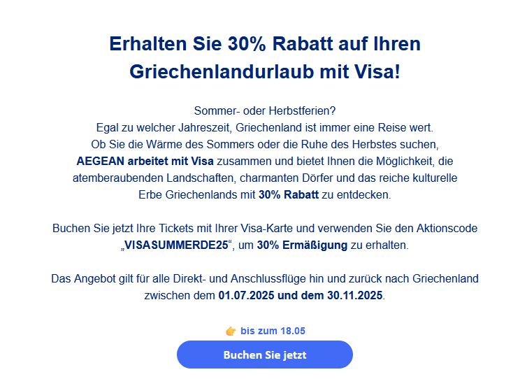 Es gibt aktuell 30% Rabatt auf alle Flüge nach GR zwischen dem 1.7. und 30.11.25 bei Bezahlung mit Visa.