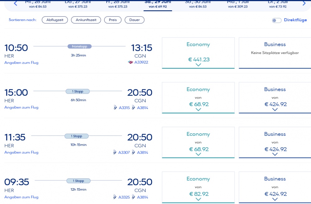 Corendon-Airlines NUE -> HER nur mit Handgepäck war günstiger, aber dann mit Zubuchung der Koffer erheblich teurer als über Check24 inkl. Koffer.