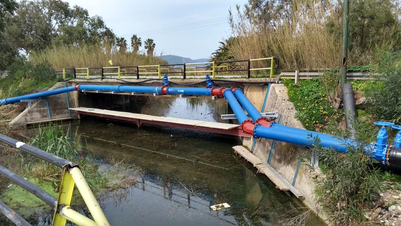 2 dicke Rohre liegen auf den Konsolen, ich vermute eine Wasserleitung von der Betongrube am Kournassee nach Rethymno.