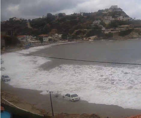 Rethymno ist auch betroffen, wie man im untersten Video sehen kann. Autos am Strand.