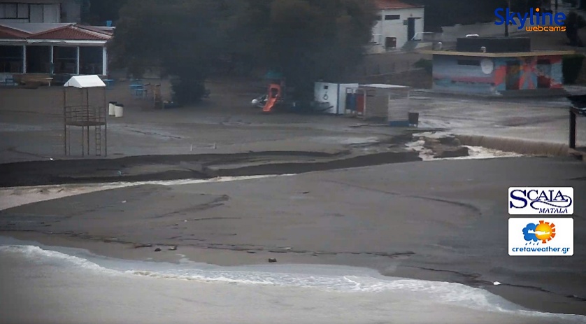 In Matala scheint es viel geregnet zu haben, da kommt ganz viel Wasser die Straße runter und hat sich einen Weg durch den Strand gebahnt