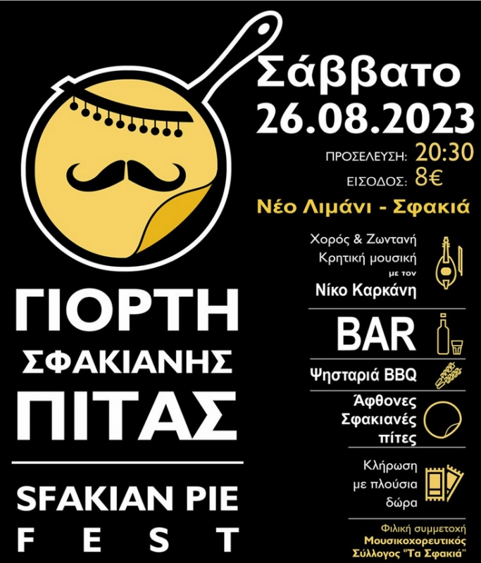 Die traditionelle Produktveranstaltung „Apokoroniotiki Gi 2023“ (vormals Agrar-August“ in Georgioupolis wird nun vom 27.8. bis 3.9. im Papadakis Park am Hafen stattfinden, 19.00–23.00 Uhr.